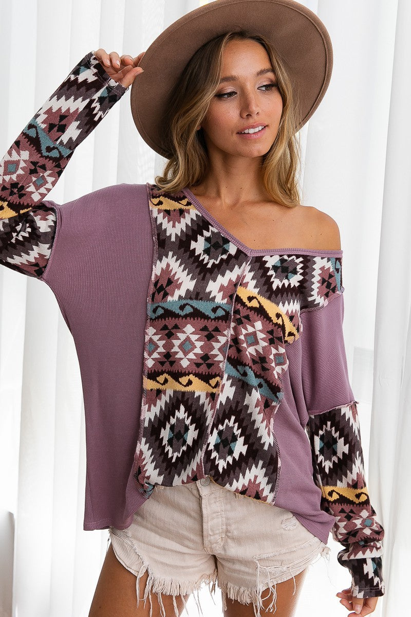 Aztec Print Mirr Color Block Lslv V Neck Top
