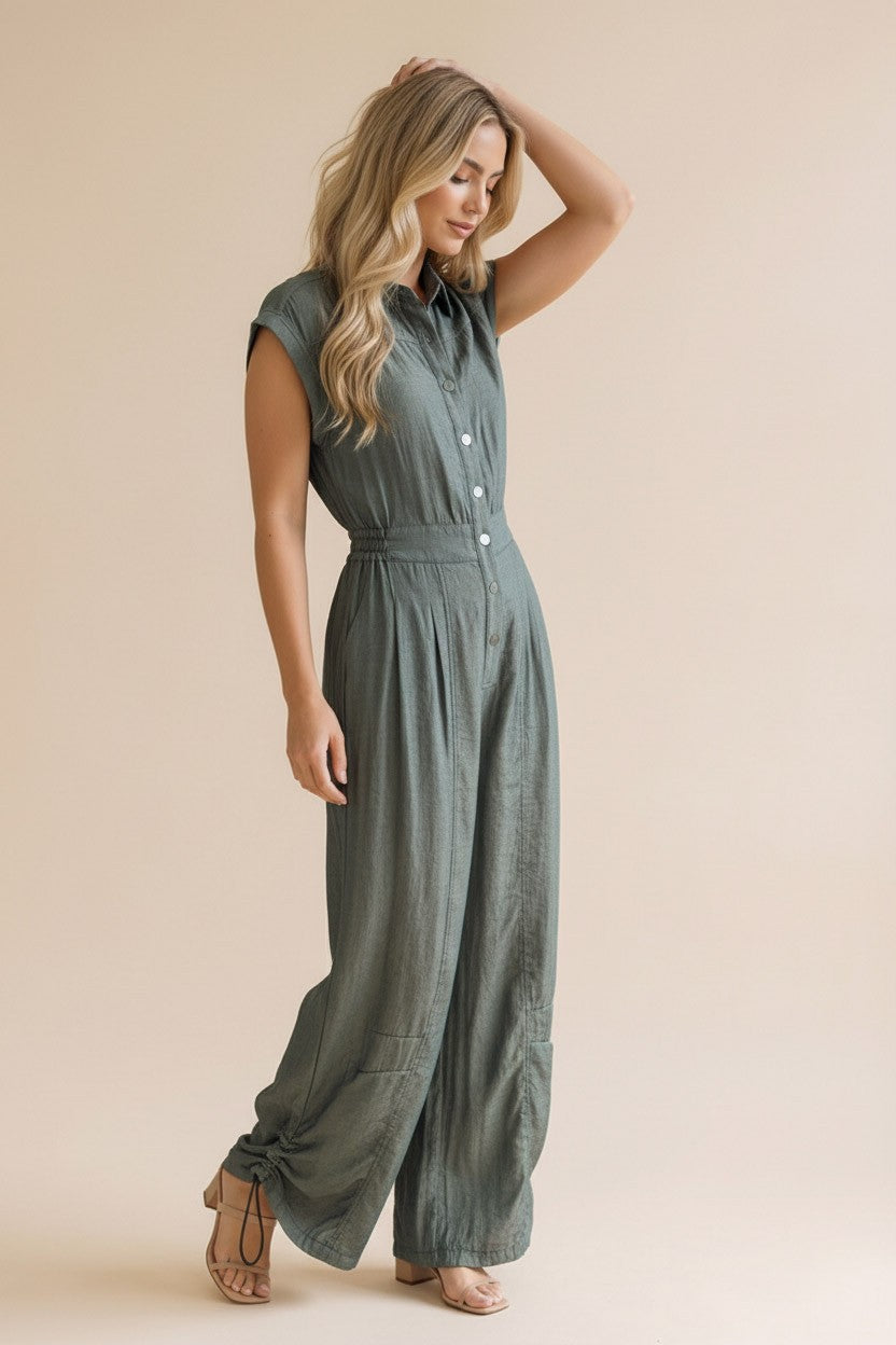 That soft olive/neutral tone is PERFECT for spring and summer, the button-front detail + elastic waist gives shape without clinging, and the wide-leg fit is comfy, breezy, and SO flattering. And yes… POCKETS 🙌