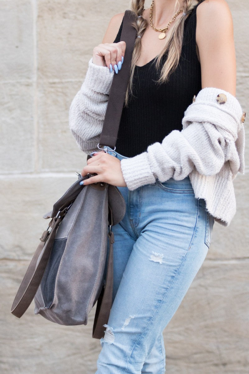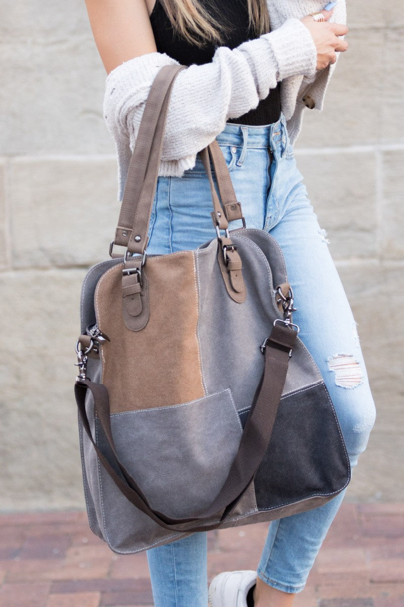 inside zipper compartment Inside zipper pocket 2 open sidewall pockets Removable Crossbody Strap Back zipper pocket Boutique quality Materials: *Canvas exterior *Lining: 60% cotton/40% polyester Product Dimension: *Width: 15" *Depth: 4.25" *Height: 13.5" Adjustable Strap Length: 29.5" min/ 52" max