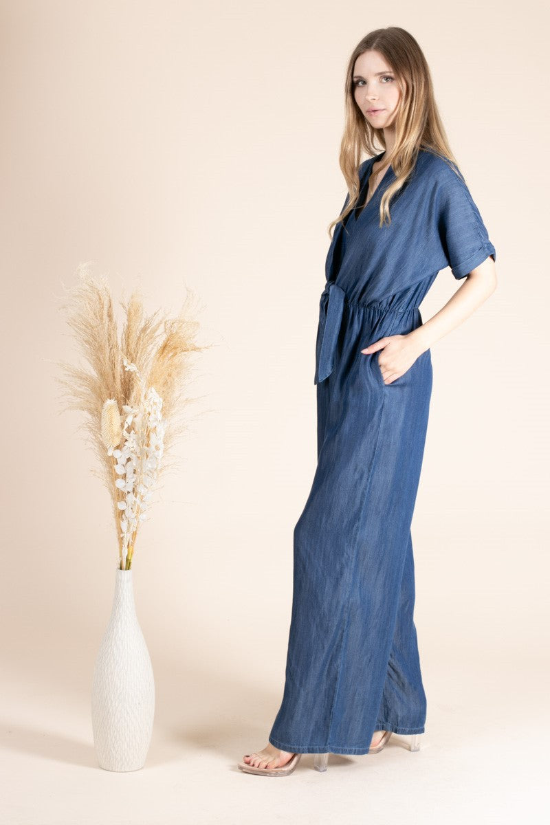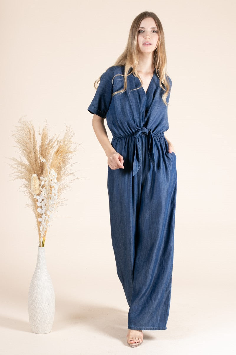 Denim Short Sleeve Front Knot Jumpsuit