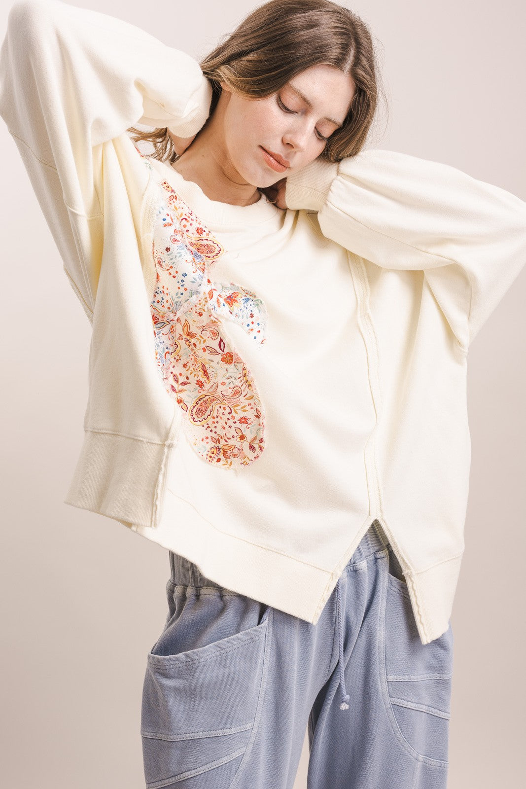 This cream + floral patchwork sweatshirt is giving boho romance meets effortless cool girl and I am absolutely here for it.