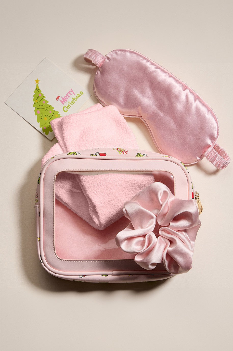 Pouch Size : 7.5" X 6.5" X 1.5" Zipper Closure Delight in a festive Christmas gift set featuring a clear cosmetic bag with holiday accents, matching scrunchie, cozy socks, satin eye mask and a card. A perfect holiday surprise for pampering and self-care.