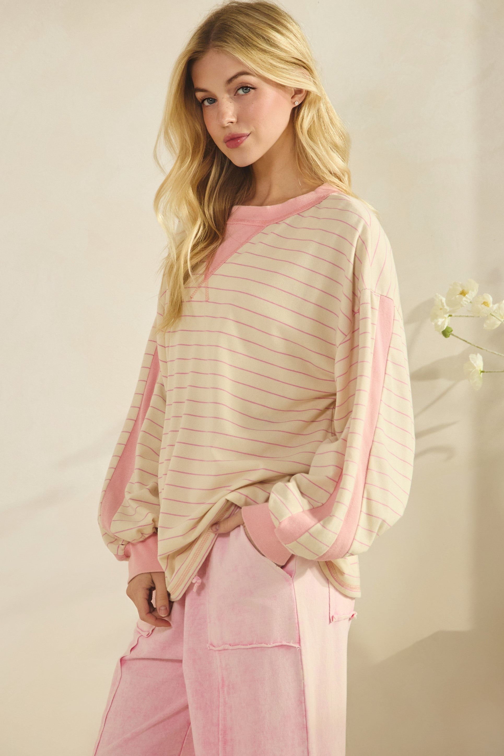 This dreamy pink + cream striped top paired with the matching pink washed wide leg pants is giving: